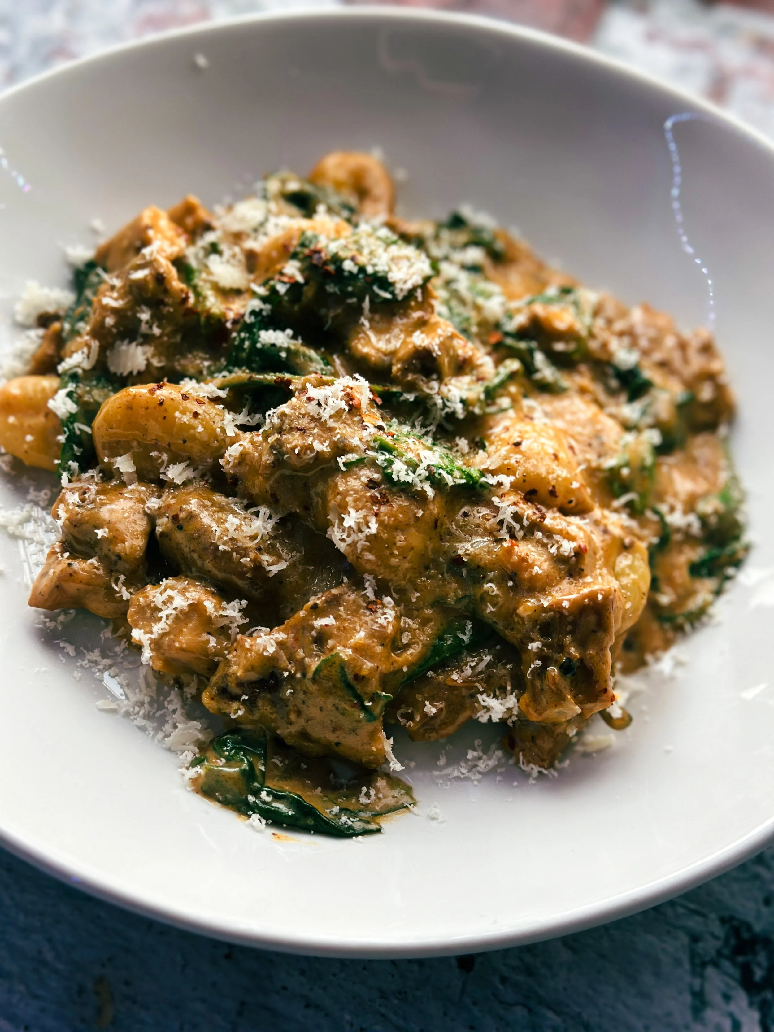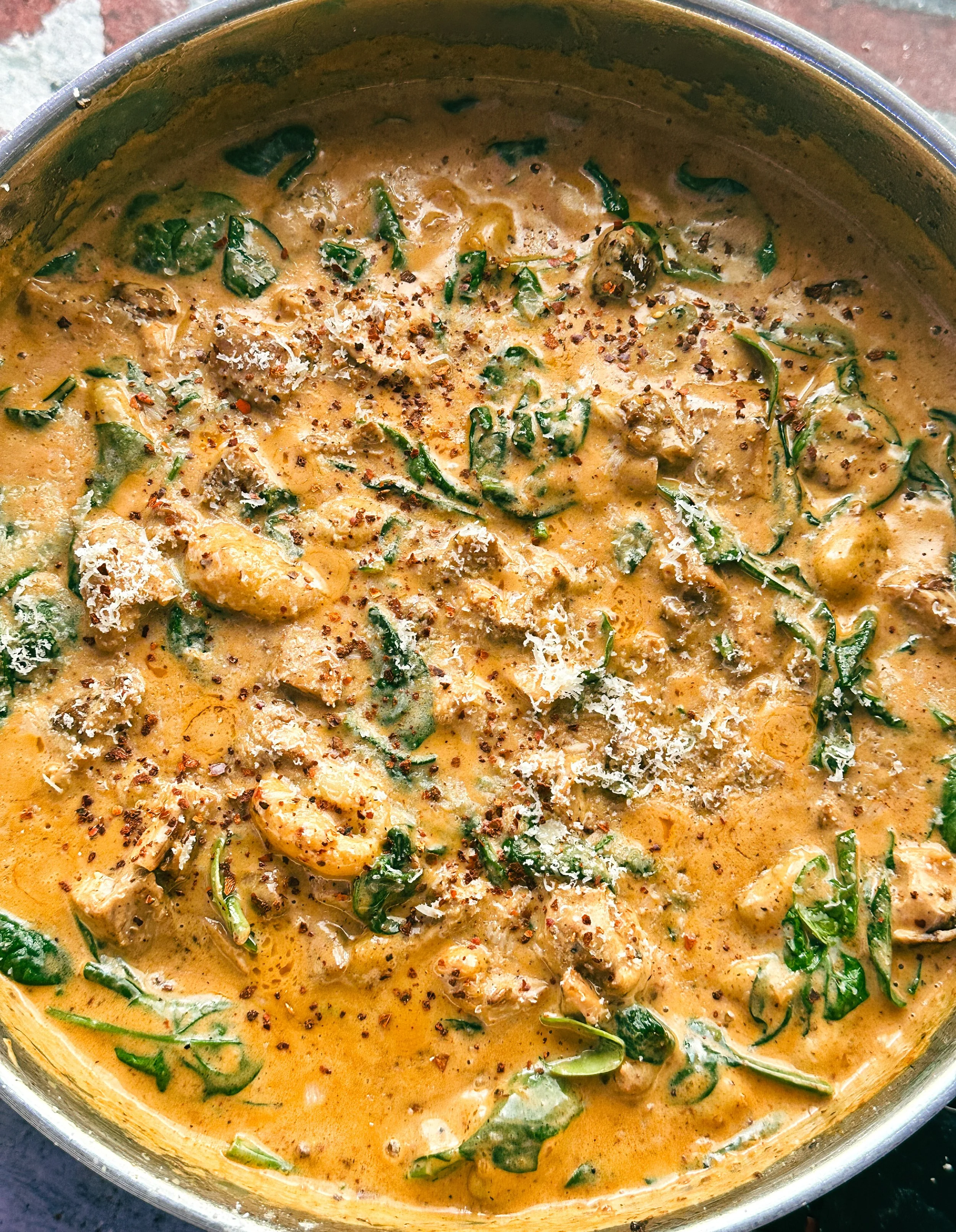Add Chicken and spinach and allow to simmer for another 4-5 minutes. Add in Parmesan cheese, stir and remove from heat.