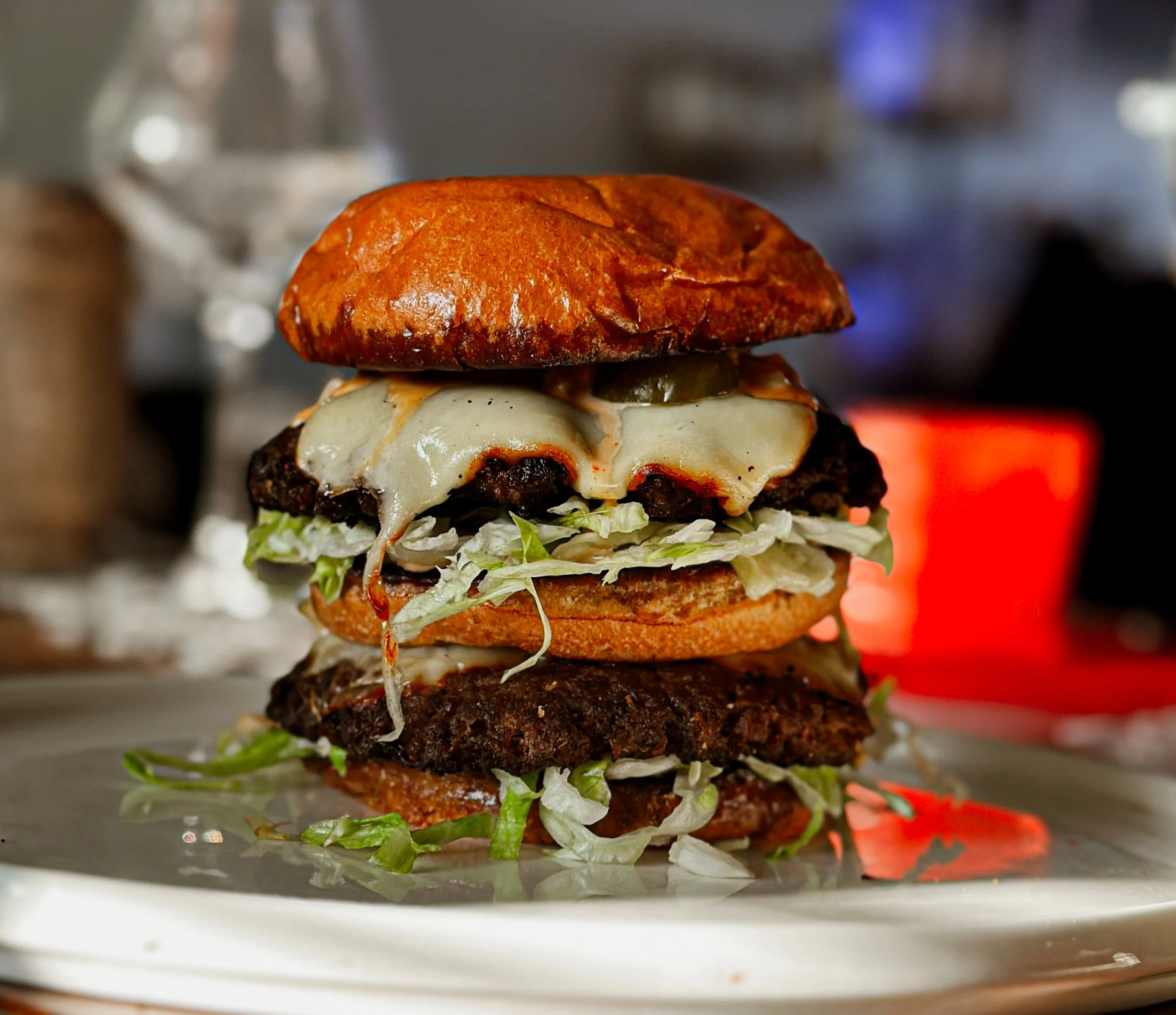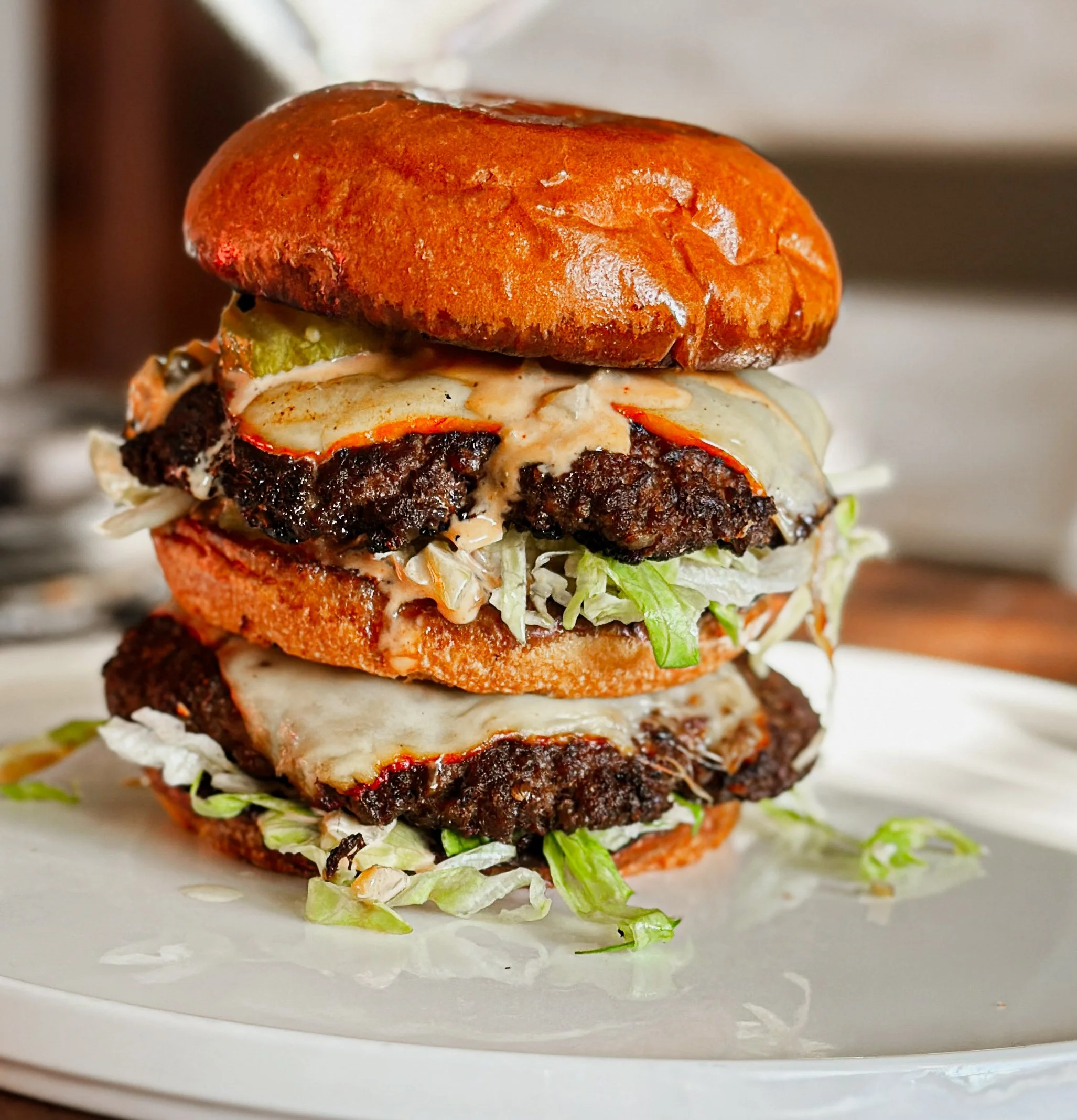 Burger pictured: Made with 80/20 Beef, Muenster Cheese, Shredded lettuce, and Bricohe Buns (toasted)
